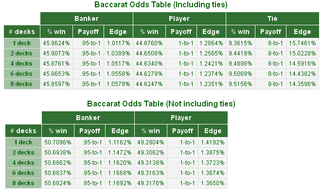 Tudo isso significa que, nas apostas do banqueiro, a borda da casa está em 1,06%. Nas apostas do jogador, a porcentagem é de 1,24%. Nas apostas, é 14,36%. E, em apostas em pares, são 11,25%.