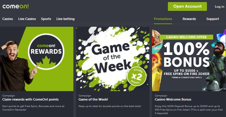 No momento da redação desta resenha, o cassino apresenta apenas duas promoções e um Oferta de boas -vindas. As duas promoções são as recompensas Comeon e o jogo da semana. Para as recompensas Comeon, você recebe pontos para quase todas as atividades que realiza no site. Por exemplo, 25 pontos são dados quando você assina diariamente. Então você também recebe pontos por cada US $ 10 depositados e US $ 1 apostada. Essas e muitas outras atividades no cassino são recompensadas com pontos. Você pode converter esses pontos em rotações gratuitas e créditos de bônus para jogar.