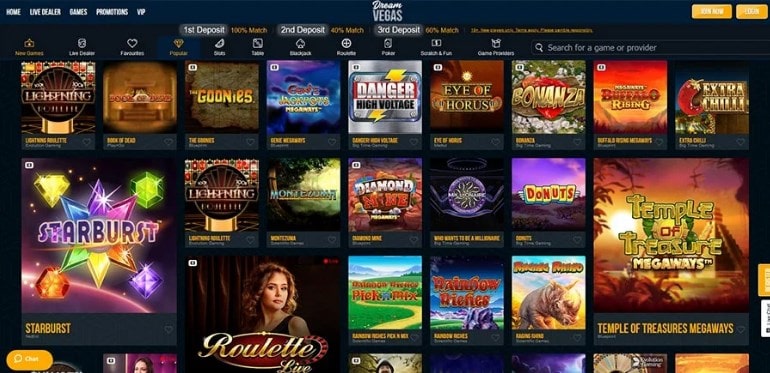 O site tem uma ampla gama de jogos categorizados em slots clássicos, slots progressivos, jogos de mesa e jogos ao vivo. No total, existem mais de mil jogos para os jogadores escolherem. Você nunca terá promoção e anúncio em vários jogos. Você pode desfrutar de ofertas de bônus Dreamvegas nos seguintes jogos:
