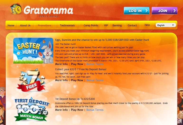 O cassino online oferece muitas ofertas fantásticas, como; O Gratorama Casino recebe bônus de US $ 7, requisitos de apostas de 30x e 40x e 100% de bônus de correspondência de até US $ 200 em depósitos iniciais de US $ 10.