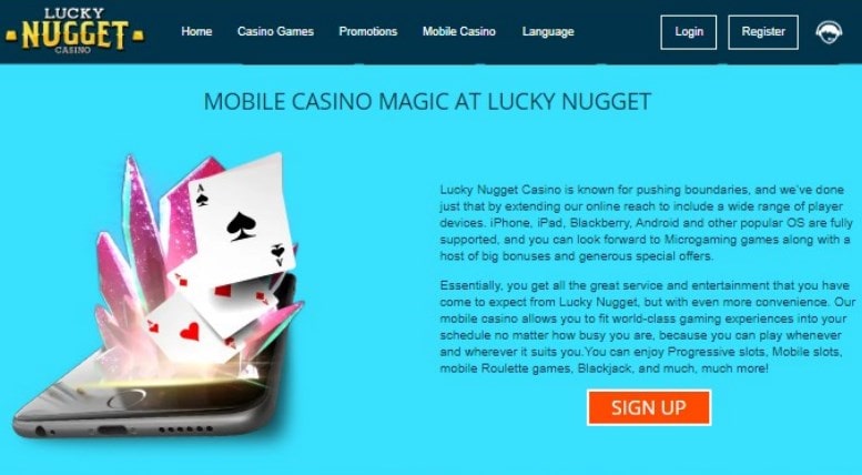 Você pode acessar o Lucky Nugget Flash Casino através de um navegador no seu dispositivo móvel. Mas também há um download de um aplicativo móvel disponível (isso é uma raridade entre Casinos online de dinheiro real).