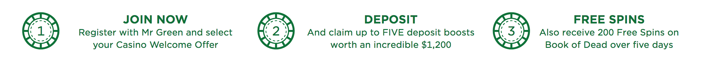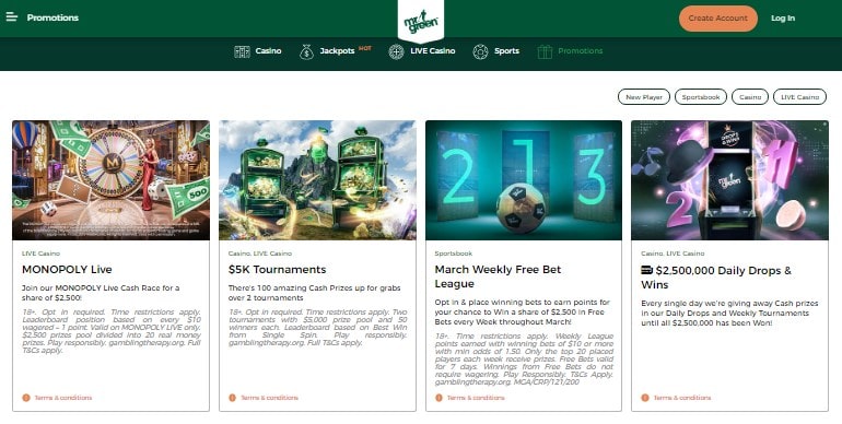 A escolha mais popular é a Bônus de 100% para jogar para cada novo jogador no cassino. Este é um bônus correspondente no valor de US $ 100 e 200 rodadas gratuitas. Aqueles que preferem apostas esportivas podem obter uma aposta gratuita de US $ 10 e jogadores de cassino ao vivo podem esperar o mesmo bônus de 100% correspondente a US $ 100. Definitivamente, essa é uma promoção para lembrar e a boa notícia é que você geralmente não precisa de códigos de bônus do MrGreen Casino para ativar essas promoções.