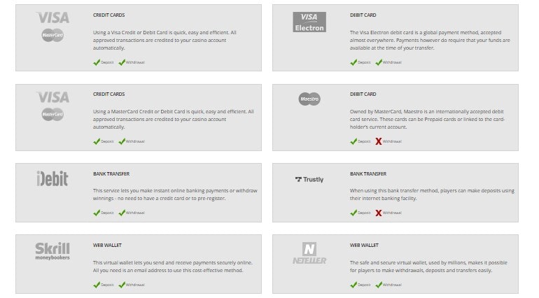 Há uma escolha limitada de opções. Mas eles são versáteis, então você provavelmente encontrará um método de pagamento de jogo aceitável entre eles. Esperamos PaySafeCard, e alguns outros.
