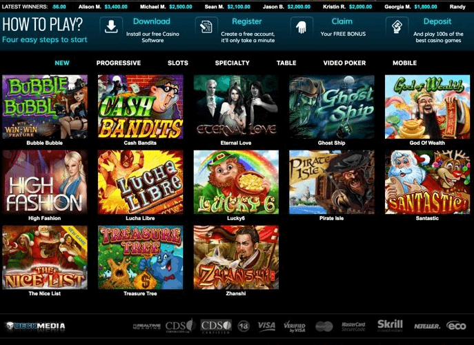 Como o próprio nome do cassino sugere, você encontrará todos os tipos de slots, incluindo slots clássicos de 3 berros, slots de 5 berros, slots 3D e todos os slots progressivos que você conhece e ama como Sevens & Stripes, o Três patetas, A Asgard Slot Machine, Eternal Love, Futebol Frenzy e o único T-Rex. Além disso, você encontrará jogos de revendedores ao vivo como pôquer e blackjack. Em suma, você pode baixar ou jogar instantâneo todos os tipos de jogos. Lista de jogos progressivos de jackpots: